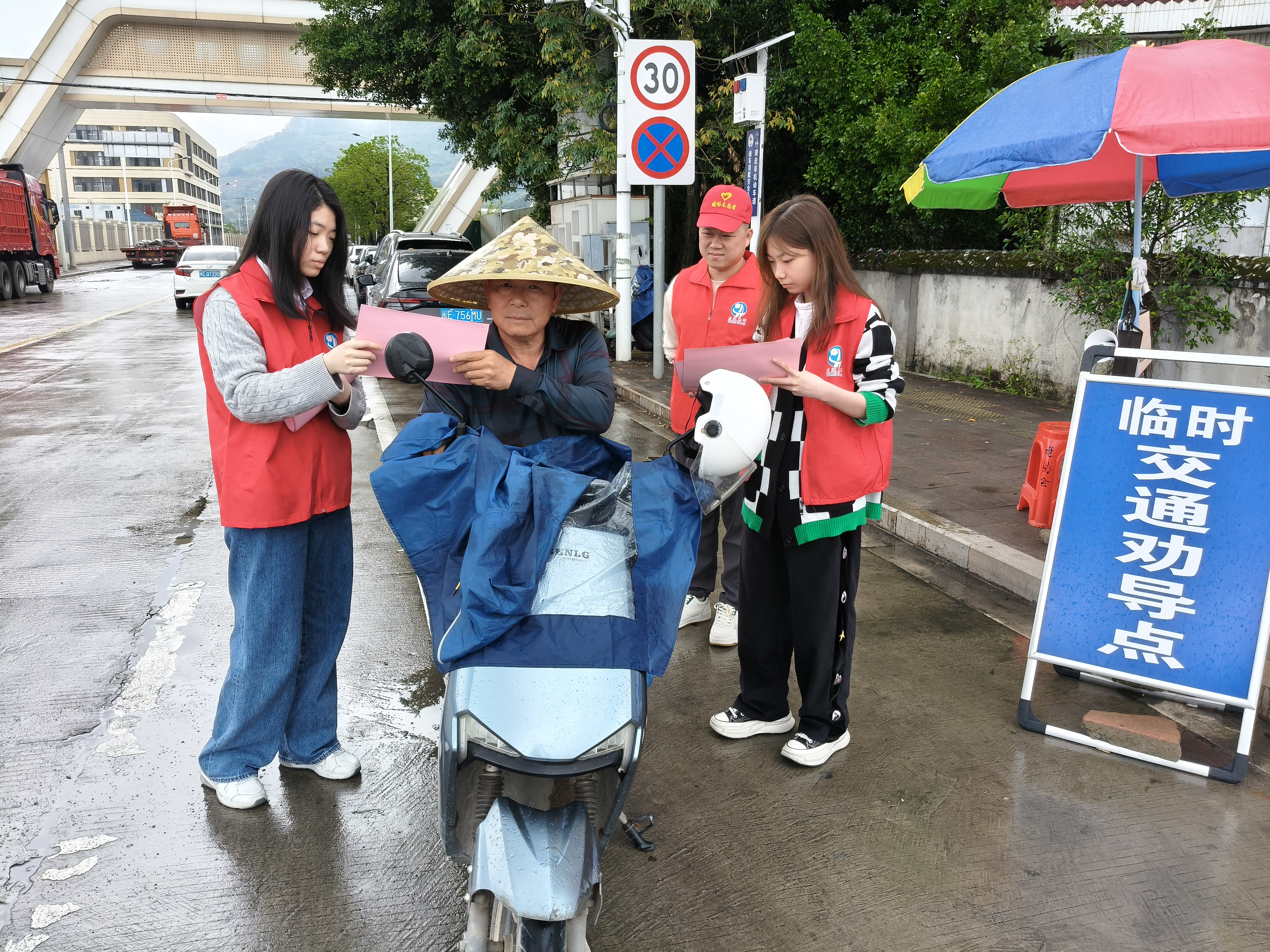 志愿者們在木棉村主要交通路口設(shè)立臨時交通勸導(dǎo)點,通過發(fā)放宣傳資料等方式,耐心地向村民們講解交通安全知識,勸導(dǎo)村民正確乘坐交通工具,增強村民安全出行意識。